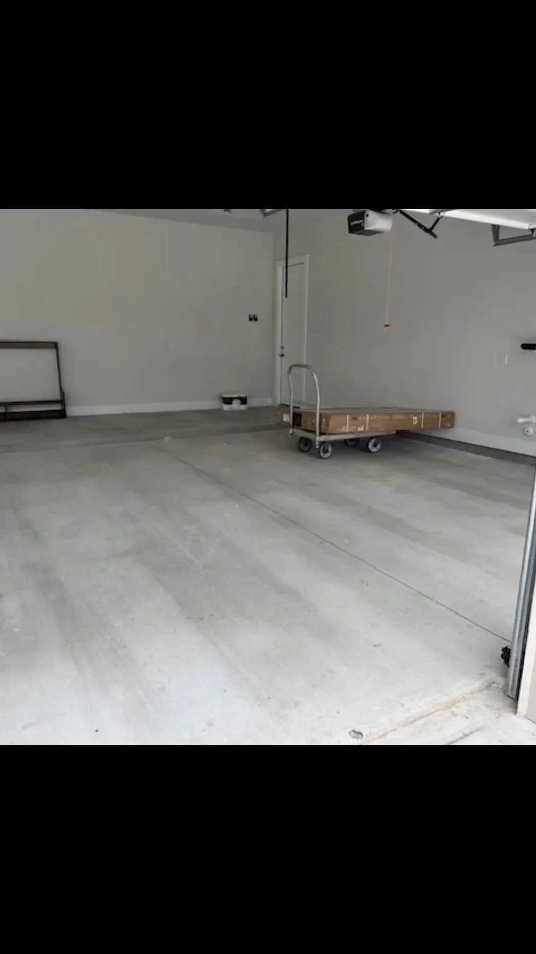 • Empty garage with painted epoxy floor, open garage door, and a view of neighboring houses outside.